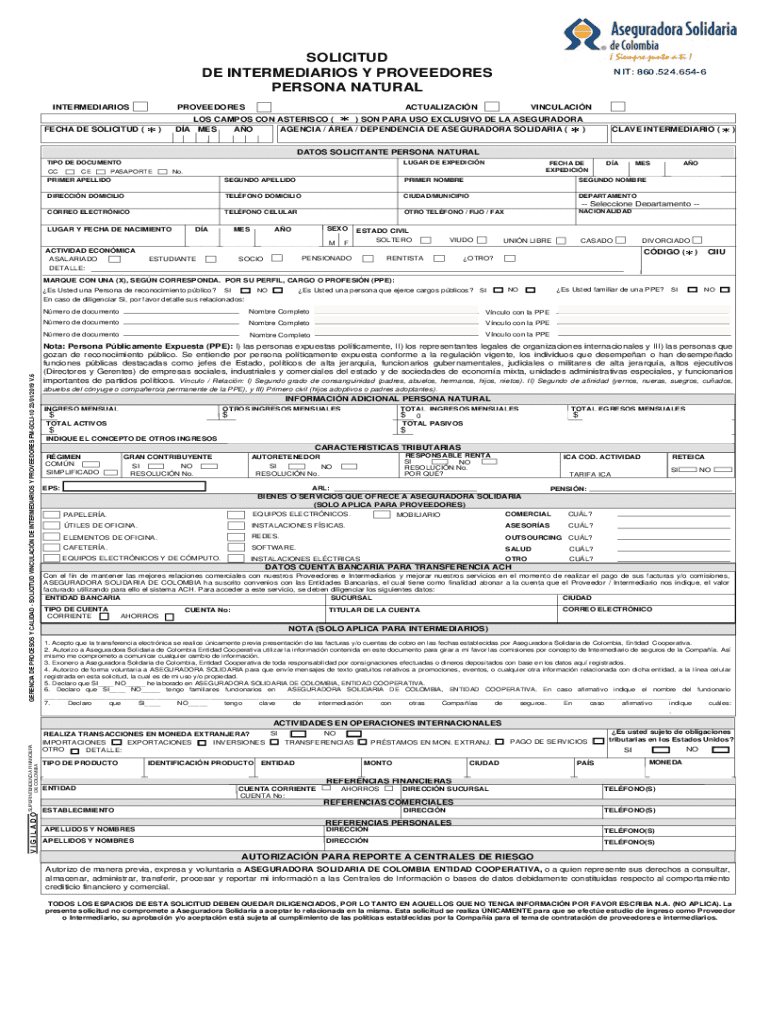 SOLICITED DE INTERMEDIARIES Y PROCEDURES PERSONA NATURAL INTERMEDIARIOSPROVEEDORESFECHA DE SOLICITED ()NIT: 860.524.6546ACTUALIZACINVINCULACINLOS CAMPOS CON ASTERISK () SON PARA USO EXCLUSIVE DE LA