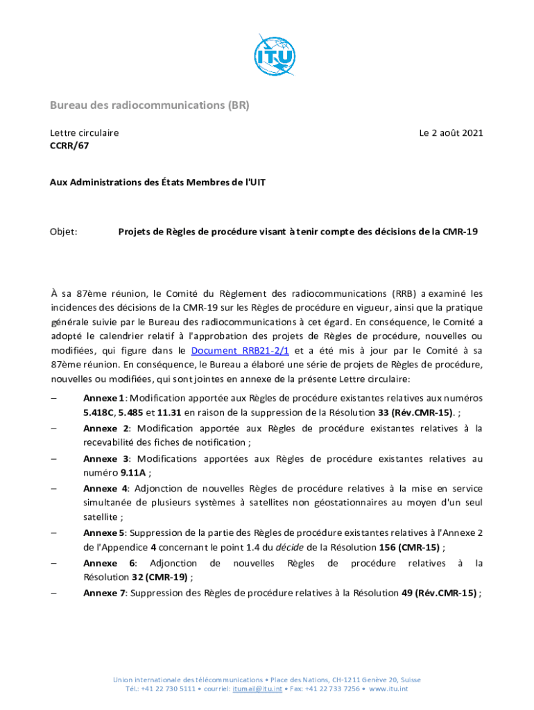 Bureau DES radio communications (BR) Letter circular CARR/67Le 2 AOT 2021Aux Administrations DES tats Members de l\'UITObjet:Projects de Rgles de procedure visit tenor compete DES decisions DE la