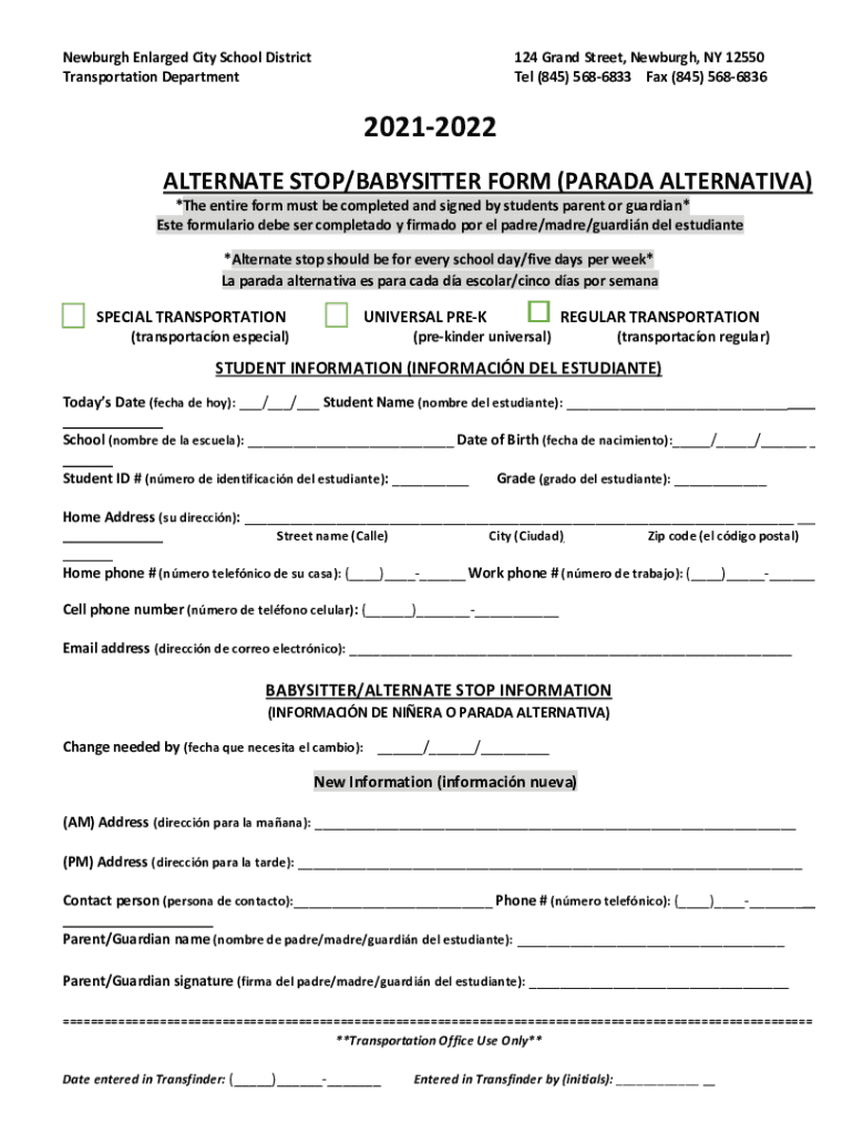 Newburgh Enlarged City School District Transportation Department124 Grand Street, Newburgh, NY 12550 Tel (845) 5686833 Fax (845) 568683620212022 ALTERNATE STOP/BABYSITTER FORM (PARADE ALTERNATIVE)*The
