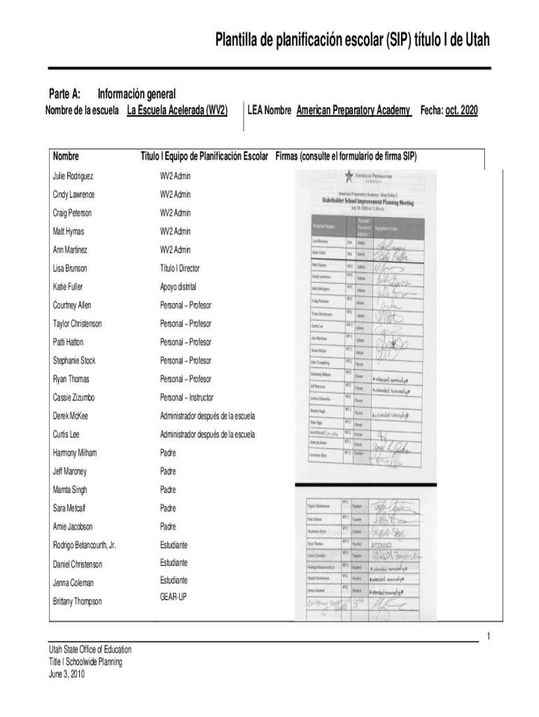Mantilla de planificacin escolar (SIP) truly I de Utah Part A:Information generalNombre de la Estella Estela Accelerate (WV2)Umbrella Hombre American Preparatory AcademyTtulo I Equip ode Planificacin