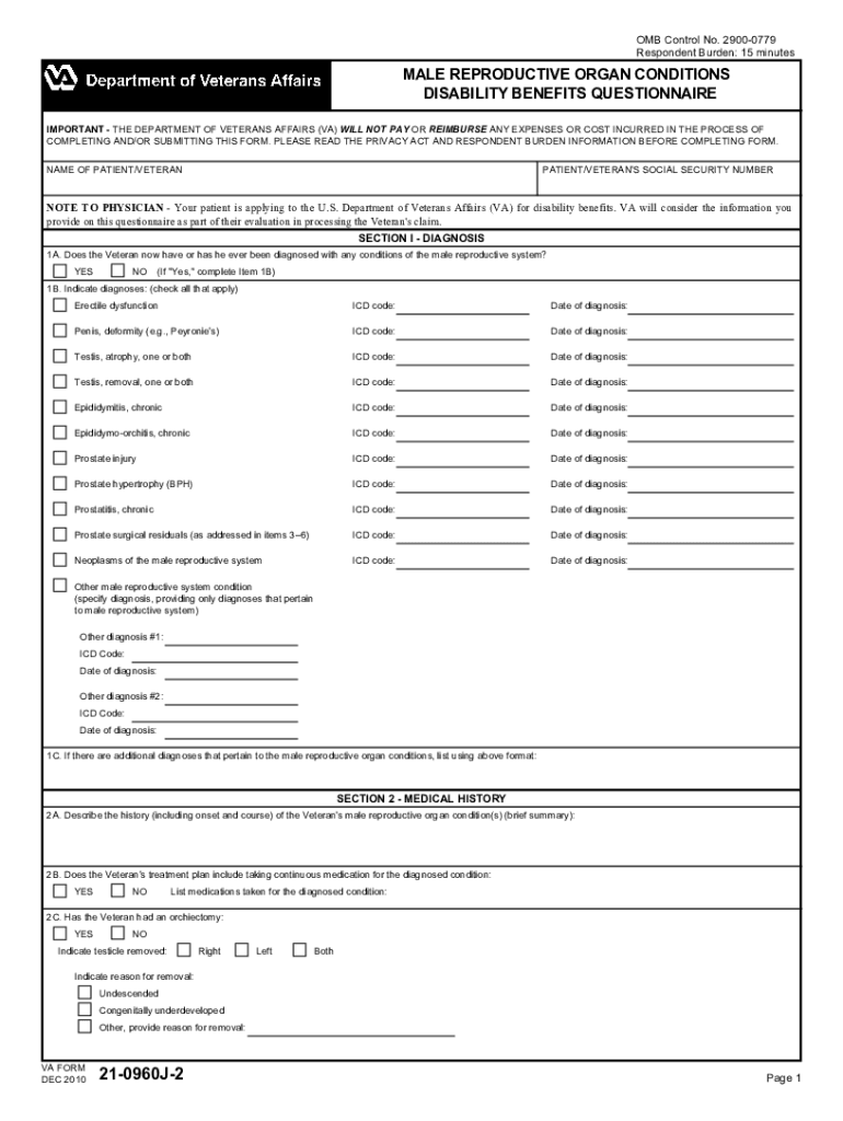 OMB Control No. 29000779 Respondent Burden: 15 minutes MALE REPRODUCTIVE ORGAN CONDITIONS DISABILITY BENEFITS QUESTIONNAIRE IMPORTANT THE DEPARTMENT OF VETERANS AFFAIRS (VA) WILL NOT PAY OR REIMBURSE