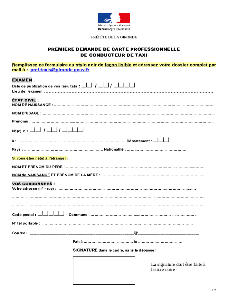 PREMIERE DEMAND DEC ARTE PROFESSIONALLY DE CONDUCT EUR DE TAXI Remplissez CE formula ire AU style noir DE fan visible ET addressed vote dossier complete par mail : preftaxis@gironde.gouv.fr EXAMEN: