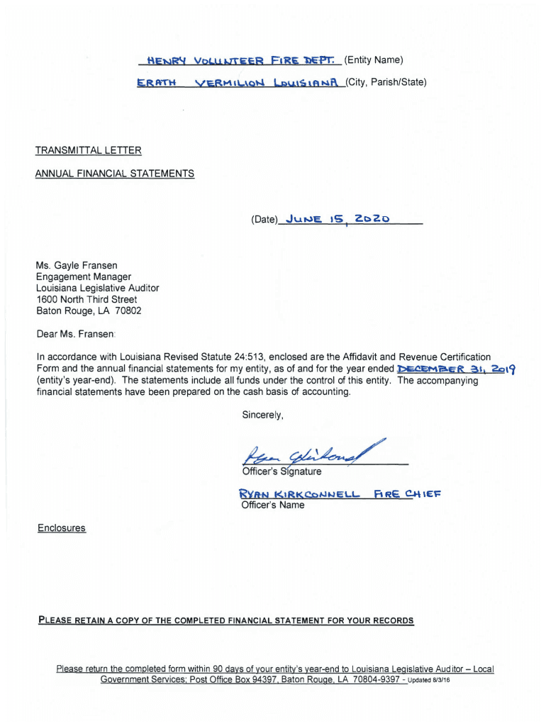 TEN(VotutJTEf;B EX\'RE f\'l.(Entity Name)VEB ll. Q l pull i (City, Parish/State)TRANSMITTAL LETTER ANNUAL FINANCIAL STATEMENTS(Date). Do ASZ.t;) \'Z.oms. Gayle Fran sen Engagement Manager Louisiana