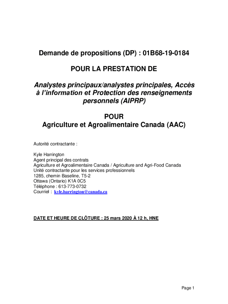 Demand DE propositions (DP) : 01B68190184 POUR LA PRESTATION DE Analyses principal/analysts principals, Acts information ET Protection DES restatements personnel (AIPP) POUR Agriculture et Agroalimentaire