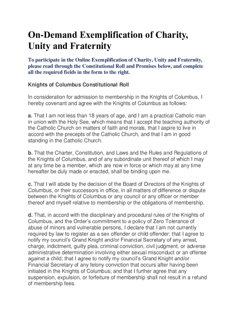 On-demand Exemplification of Charity, Unity and Fraternity To participate in the Online Exemplification of Charity, Unity and Fraternity, please read through the Constitutional Roll and Promises below,