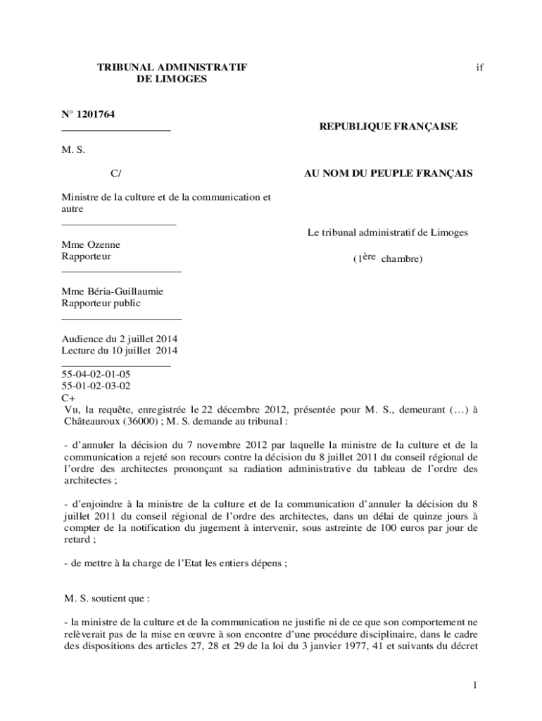Tribunal ADMINISTRATION DE LIMOGES 1201764 ___REPUBLICAN FRANCISCO. S. C/AU NOT DU PEOPLE FRANAISMinistre de la culture et de la communication ET outré ___ Le tribunal administration de Limoges Mme