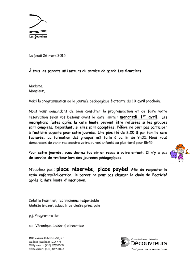 Le Jedi 26 Mars 2015 tousles parents utilisateurs Du service DE garden Les SourciersMadame, Monsieur, Voice la programmatic DE la journey pedagogue dilettante Du 10 April pro chain. Nous vows demands