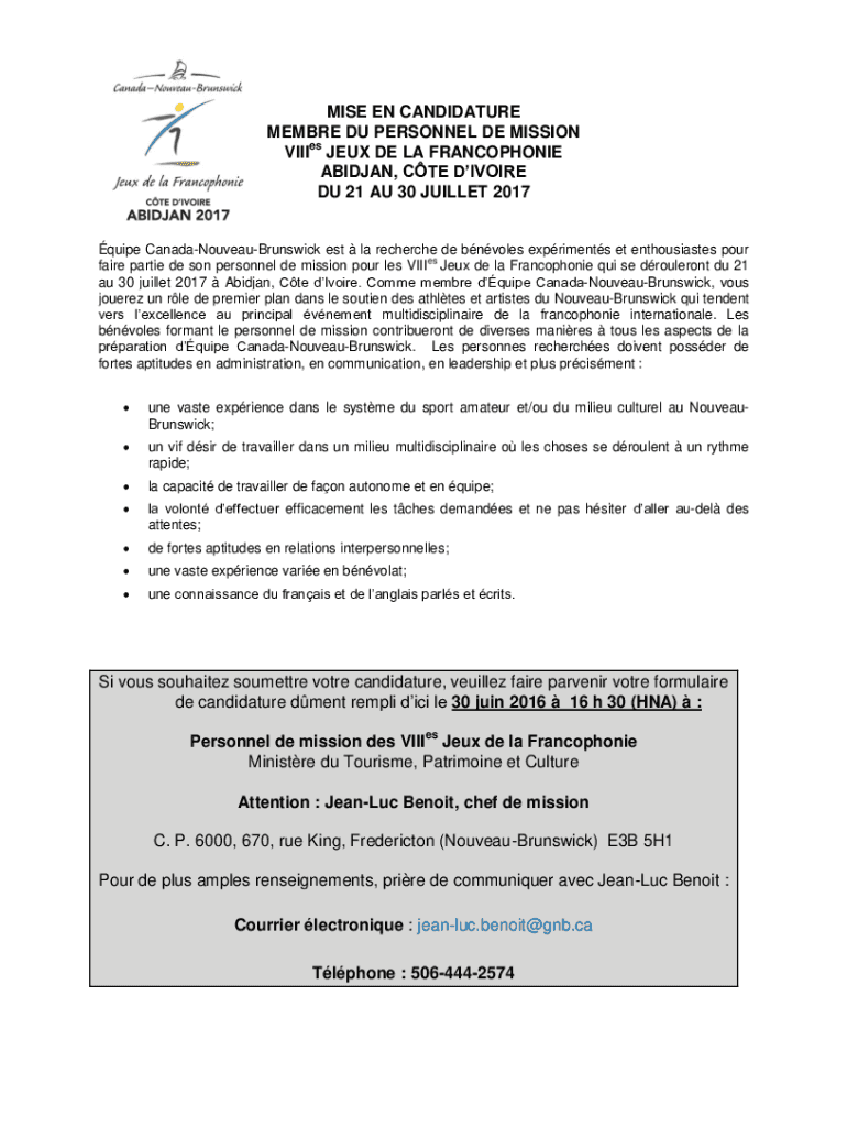 MILE EN CANDIDATURE MEMBER DU PERSONNEL DE MISSION VIII BS EX DE LA FRANCOPHONE ABIDJAN, CTE DIVORCE DU 21 AU 30 BULLET 2017 quite CanadaNouveauBrunswick est la recherché DE involves experiment set