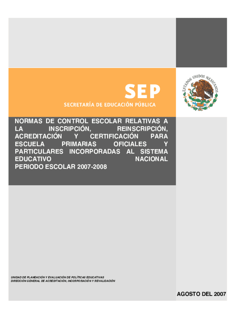 SEP SECRETARY DE EDUCATION PBL ICA NORMAL DE CONTROL ESCOLAR RELATIVES À la INSCRIPTION, REINSCRIPCIN, ACCREDITATION Y CERTIFICATION PARA ESTELA PRIMARIES OFFICIALS Y PARTICULARS INCORPORATES AL