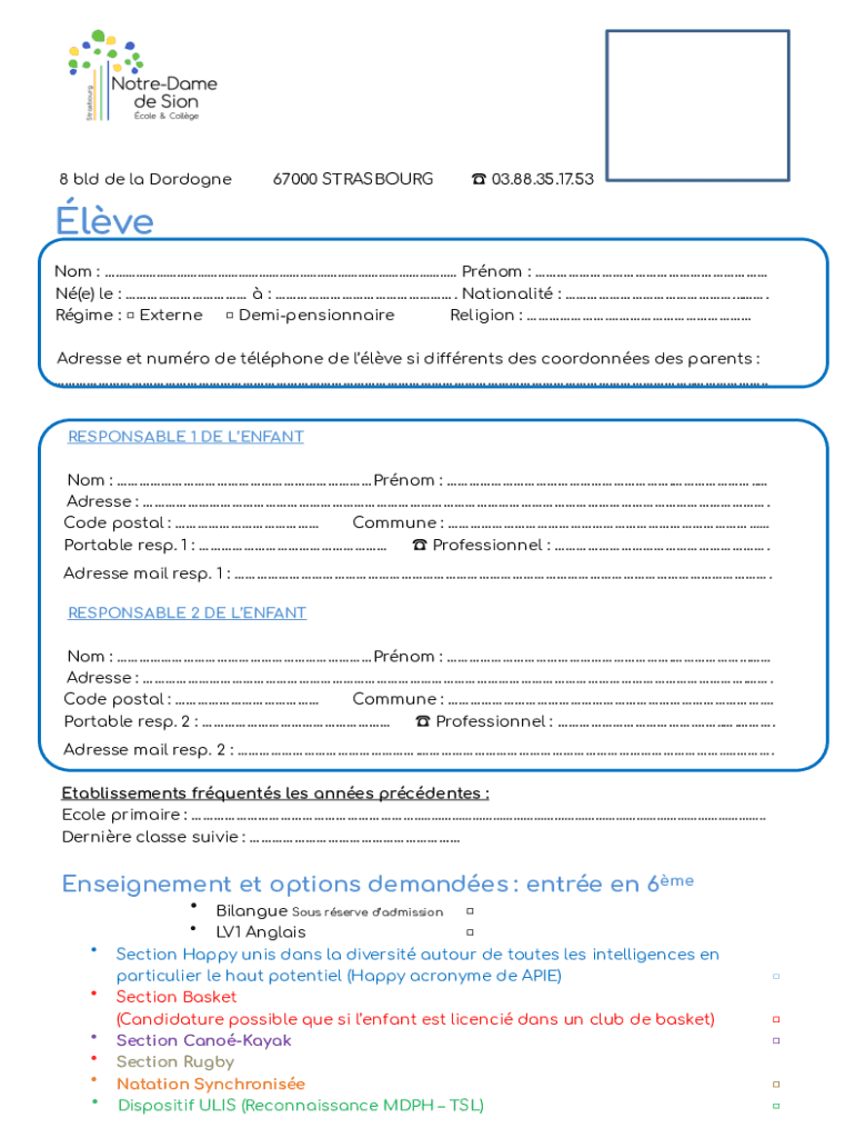 67000 STRASBOURG03.88.35.17.53lve Not: ....................................................................................................... Prom: N(e) LE: :. Nationalist: .... Regime: Extent Demipensionnaire