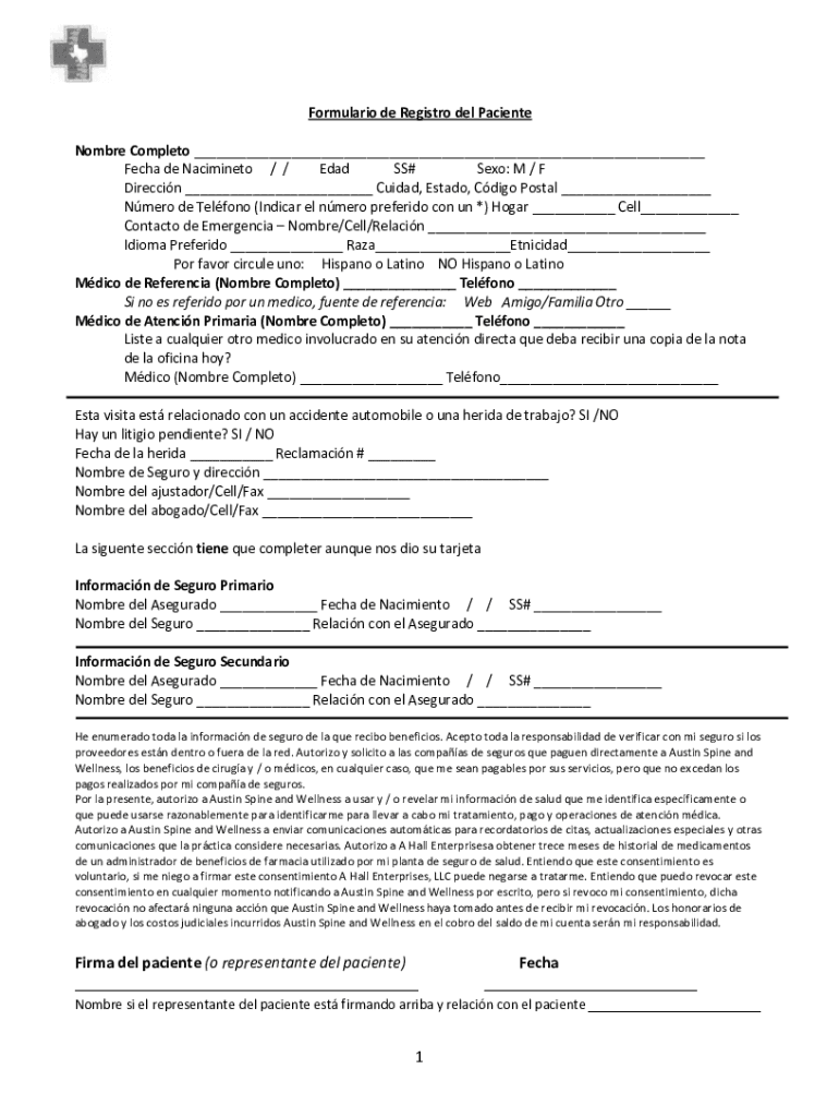 Formulation de Registro Del Patients Hombre Complete ___ Tech de Nacimineto / / Dad SS# SEO: M / F Direction ___ Ciudad, Est ado, Cargo Postal ___ Nero de Telfono (IndyCar el Nero preferred con UN