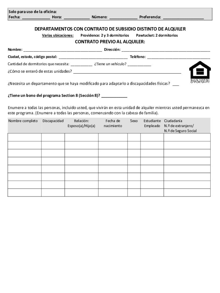 Solo para us ode la official: Tech: ___ Hora: ___ Nero: ___ Preference: ___DEPARTMENTS CON CONTRALTO DE SUBSIDIES DISTINCT DE AQUIFER Varies ubicaciones:Providence: 2 y 3 dormitoriosPawtucket: 2 dormitoriosCONTRATO