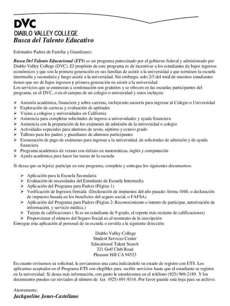 Busch Del Talent Educative Estimates Padres DE Familiar y Guardians: Busch Del Talent Educational (ETS) BS UN program patrocinado PO Rel governor federal y administrator POR Diablo Valley College