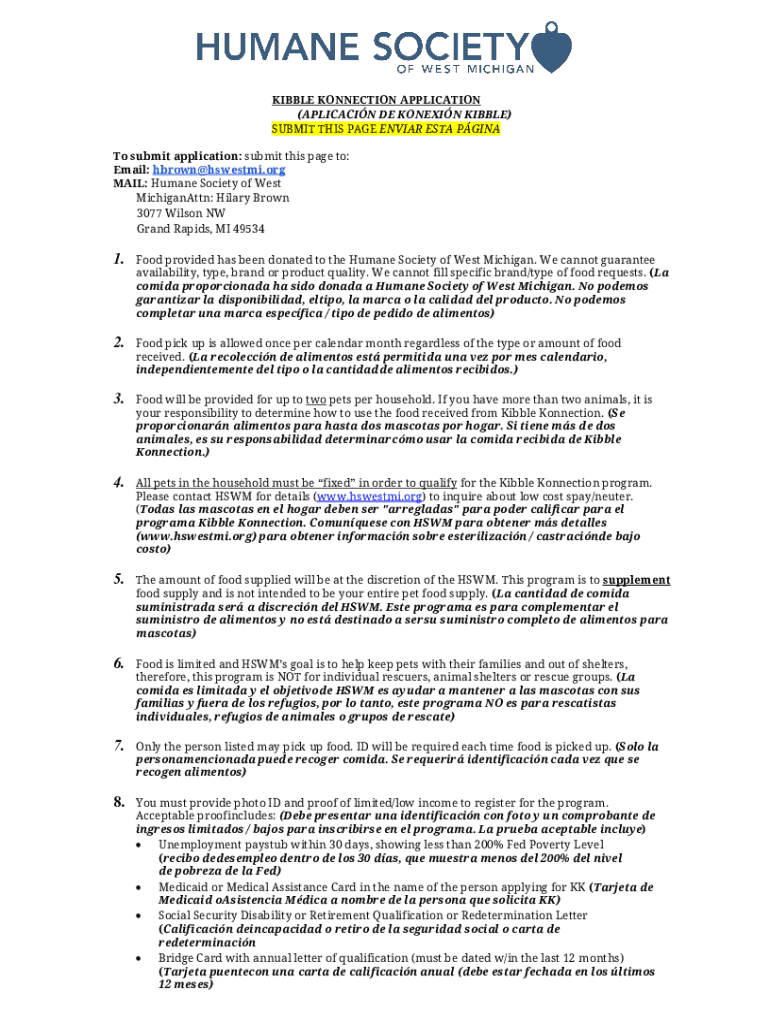 KIBBLE CONNECTION APPLICATION (APPLICATION DE ONEGIN KIBBLE) SUBMIT THIS PAGE CAVIAR ESTA GINA To submit application: submit this page to: Email: hbrown@hswestmi.org MAIL: Humane Society of West Michigan