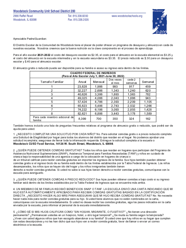 Woodstock Community Unit School District 200 2990 Rafael Road Woodstock, IL 60098Tel: 815.338.8200 Fax: 815.338.2005www.woodstockschools.orgApreciable Padre/Guardian: El District Escolar DE la Communized
