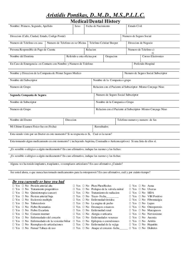 Aristides Pontiac, D. M. D., M.S., P.L.L.C. Medical/Dental History Hombre: Primer, Segundo, ApellidoSexoFecha de NacimientoEstado CivilDireccion (Called, Ciudad, Est ado, Congo Postal) Number de Telefono