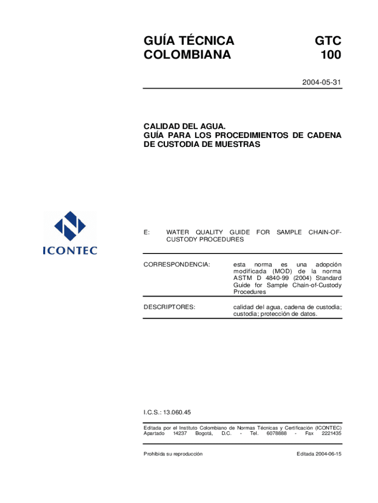 GUA TCN ICA COLOMBIANAGTC 100 20040531CALIDAD DEL AGRA. GUA PARA LOS PROCEDIMIENTOS DE CADENZA DE CUSTODIAL DE SUBSTRATE:WATER QUALITY GUIDE CUSTODY PROCEDURESFORSAMPLECHAINOFCORRESPONDENCIA:ESTA