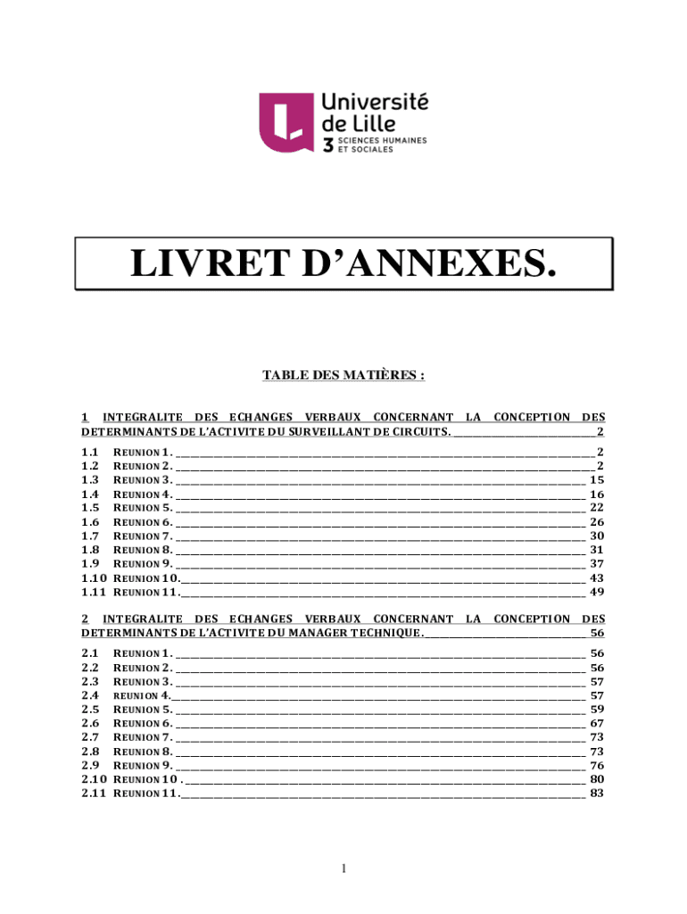 LIVE ANNEXES. TABLE DES MATURES : 1 INTEGRAL ITE DESE CHANGES VERB AUX CONCERN ANT LA CONCEPTION DES DETERMINANTSDELACTIVITEDUSURVEILLANTDECIRCUITS. ___2 1.1 REUNION1.___2 1.2 REUNION2.___2 1.3 REUNION3.___15