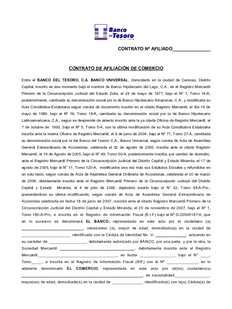 CONTRALTO N AFILIADO___CONTRATO DE AFFILIATION DE COMER CIO Entire El Banco DEL RESORT, C.A. BANCO UNIVERSAL, domiciliary en la Ciudad de Caracas, District Capital, inscribe en ESE moment banjo El