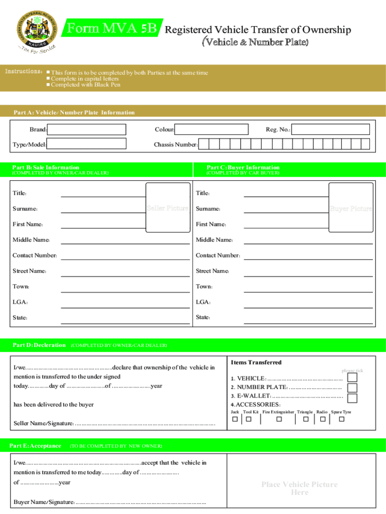 Form MVA 5B Instructions:Registered Vehicle Transfer of Ownership (Vehicle & Number Plate)This form is to be completed by both Parties at the same time Complete in capital letters Completed with Black