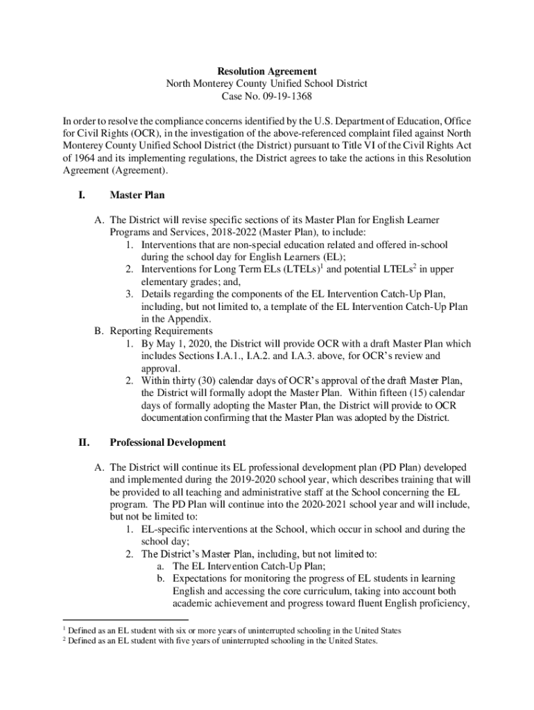 Resolution Agreement North Monterey County Unified School District Case No. 09191368 In order to resolve the compliance concerns identified by the U.S. Department of Education, Office for Civil Rights