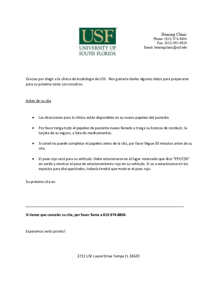 Get the free PDF Gracias por elegir a la clnica de Audiologa de USF. Nos gustara ...