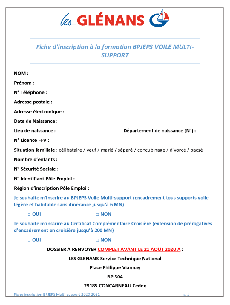 Fiche inscription la formation BPJEPS VOILE MULTISPORT NOT : Prom : N Tl phone : Address postal : Address Veronique : Date de Naissance : Lieu de Renaissance :Department de Renaissance (N) :N License