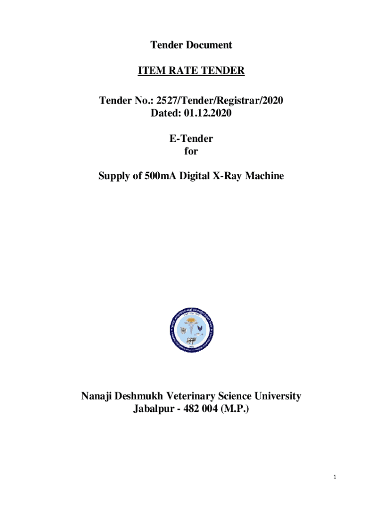 Tender Document ITEM RATE TENDER No.: 2527×Tender×Registrar×2020 Dated: 01.12.2020 Tender for Supply of 500mA Digital Ray MachineNanaji Deshmukh Veterinary Science University Jabalpur 482 004 ×M.P.×1Nanaji