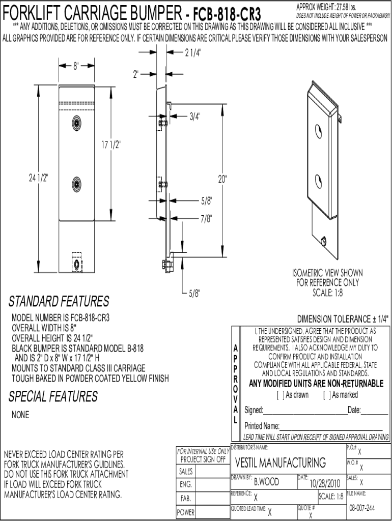 FORKLIFT CARRIAGE BUMPER FCB818CR3APPROX WEIGHT: 27.58 lbs. DOES NOT INCLUDE WEIGHT OF POWER OR PACKAGING!!!*** ANY ADDITIONS, DELETIONS, OR OMISSIONS MUST BE CORRECTED ON THIS DRAWING AS THIS DRAWING