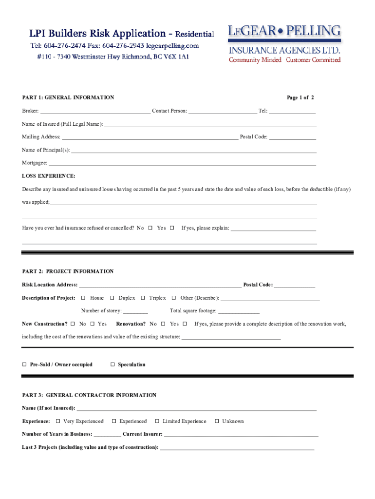 PART 1: GENERAL INFORMATION Page 1 of 2Broker: ___ Contact Person: ___ Tel: ___ Name of Insured (Full Legal Name): ___ Mailing Address: ___ Postal Code: ___ Name of Principal’s): ___ Mortgagee: