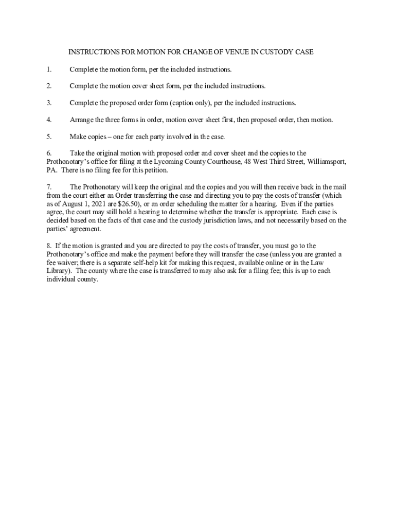 INSTRUCTIONS FOR MOTION FOR CHANGE OF VENUE IN CUSTODY CASE 1. Complete the motion form, per the included instructions.2. Complete the motion cover sheet form, per the included instructions.3. Complete