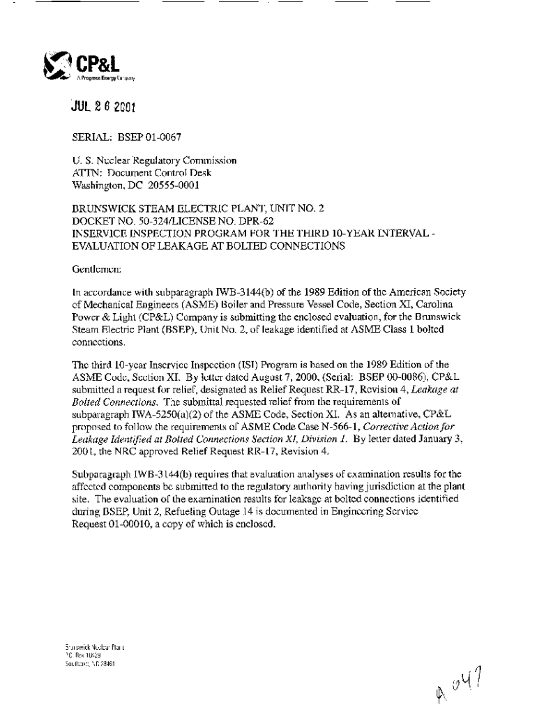 Ad Press Edgy Company 2 6 2001 SERIAL: BEEP 010067 U. S. Nuclear Regulatory Commission ATTN: Document Control Desk Washington, DC 205550001 BRUNSWICK STEAM ELECTRIC PLANT, UNIT NO. 2 DOCKET NO. 50324×LICENSE
