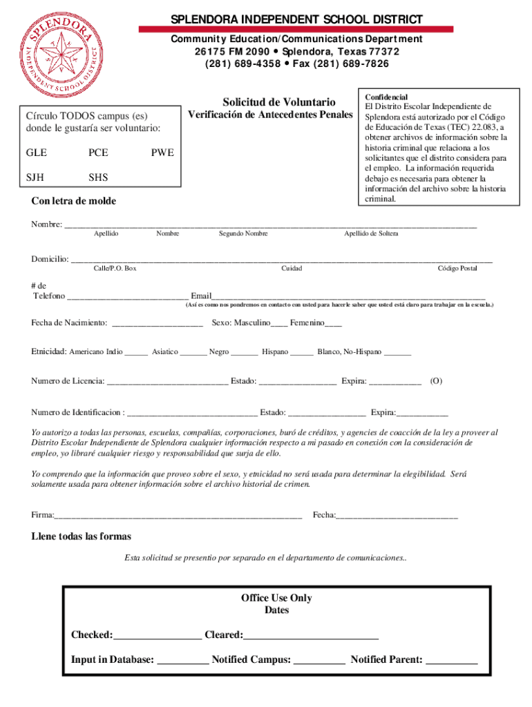 SPLENDOR INDEPENDENT SCHOOL DISTRICT Community Education×Communications Department 26175 FM 2090 Splendor, Texas 77372 ×281× 6894358 Fax (281× 6897826 ConfidencialSolicitud de Voluntario Could