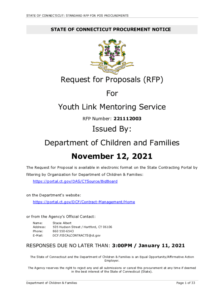 STATE OF CONNECTICUT: STANDARD RFP FOR POS PROCUREMENTSSTATE OF CONNECTICUT PROCUREMENT NOTICERequest for Proposals (RFP) For Youth Link Mentoring Service RFP Number: 221112003Issued By: Department