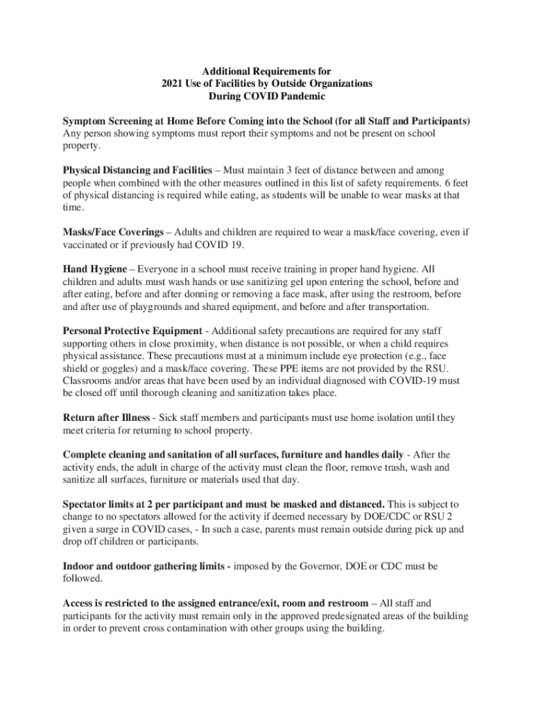 Additional Requirements for 2021 Use of Facilities by Outside Organizations During COVID-19 Pandemic Symptom Screening at Home Before Coming into the School (for all Staff and Participants) Any person