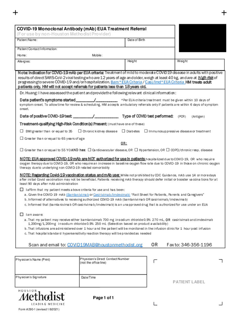 COVID-19 Monoclonal Antibody (may) EUA Treatment Referral (For use by nonHouston Methodist Provider) Patient Name:Date of BirthPatient Contact Information: Home:Mobile: HeightAllergies:Weight Note: