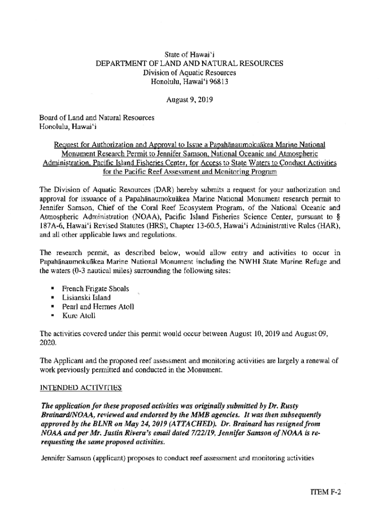 State of Hawaii DEPARTMENT OF LAND AND NATURAL RESOURCES Division of Aquatic Resources Honolulu, Hawaii 96813 August 9, 2019, Board of Land and Natural Resources Honolulu, Hawaii Request for Authorization