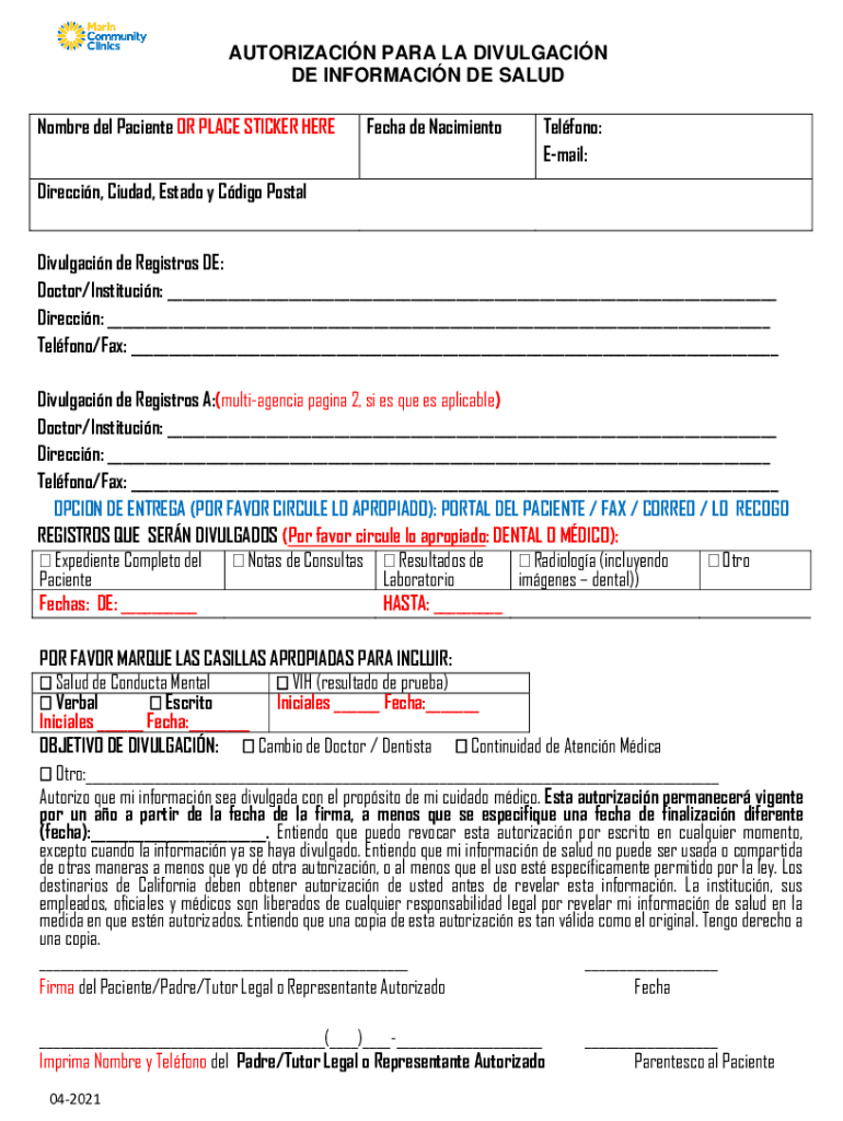 AUTHORIZATION PARA LA DIVULGATION DE INFORMATION DE SALAD Hombre Del Patients OR PLACE STICKER Perfecta de NacimientoTelfono: Email:Direction, Ciudad, Est ado y Cargo Postal Divulgation de Registros