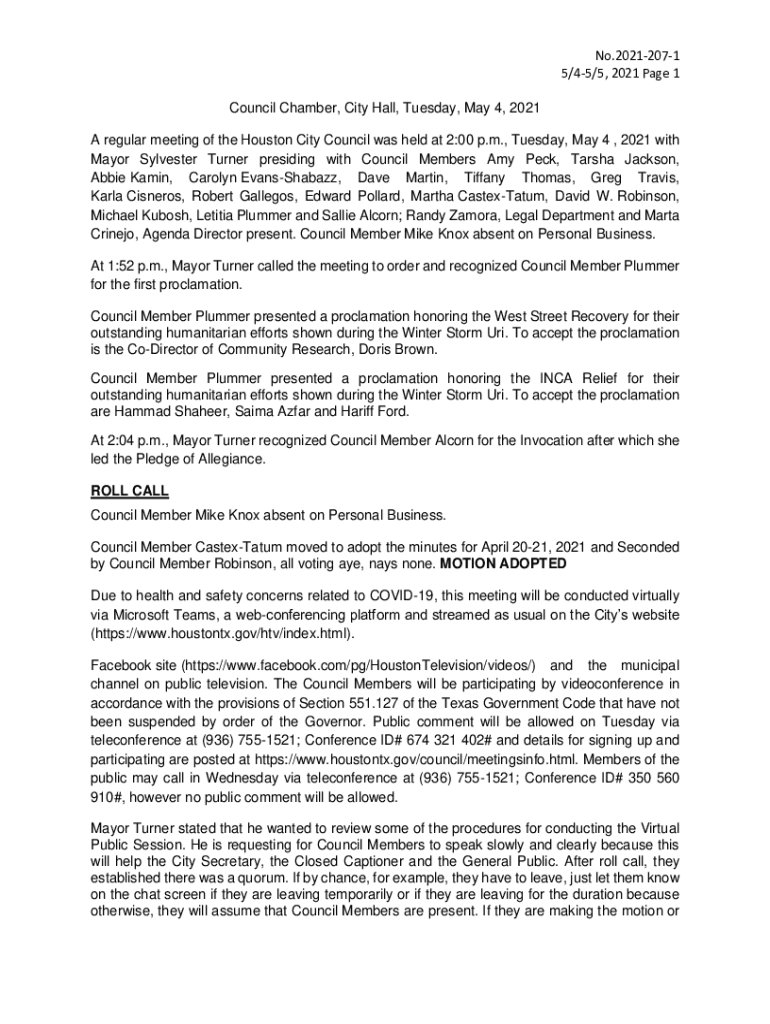 No.20212071 5×45/5, 2021-Page 1 Council Chamber, City Hall, Tuesday, May 4, 2022 A regular meeting of the Houston City Council was held at 2:00 p.m., Tuesday, May 4, 2022 with Mayor Sylvester Turner