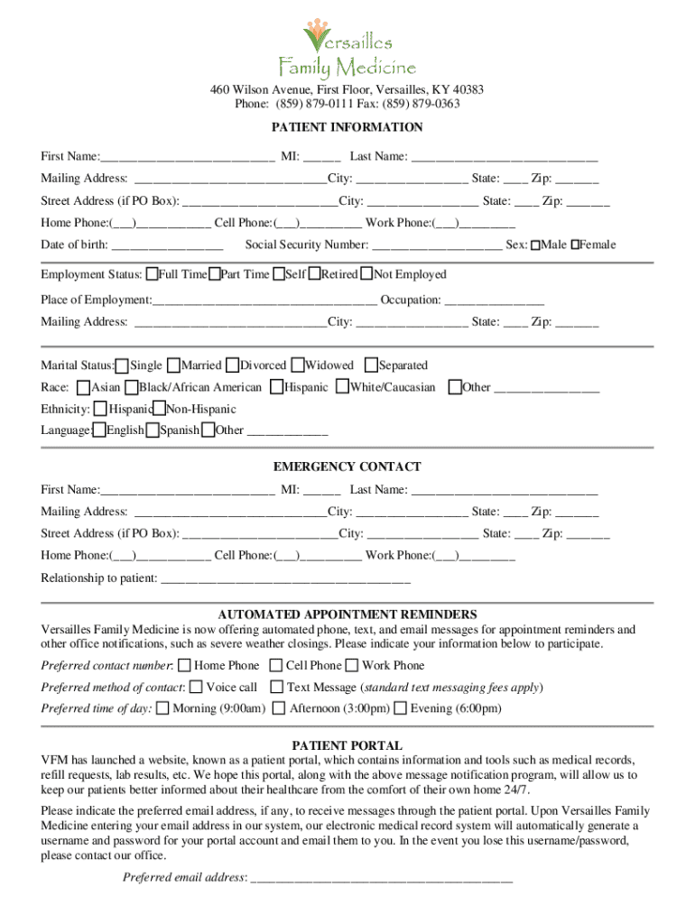 460 Wilson Avenue, First Floor, Versailles, KY 40383 Phone: (859× 8790111 Fax: (859× 8790363 PATIENT INFORMATION First Name:___ MI: ___ Last Name: ___ Mailing Address: ___City: ___ State: ___ Zip: