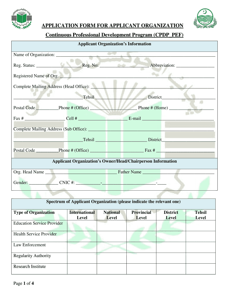 APPLICATION FORM FOR APPLICANT ORGANIZATION Continuous Professional Development Program (CPDP PEF) Applicant Organization s Information Name of Organization: Reg. Status: Reg. No: Abbreviation: Registered