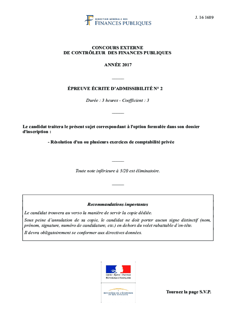 J. 16 1689CONCOURS EXTENT DE CONTROLLER DES FINANCES PUBLISHES ANNE 2017 ___ PROVE WRITE ADMISSIBILITY N 2 Due : 3 here Coefficients : 3 ___ Le candidate trait era LE present suet correspondent l\'option