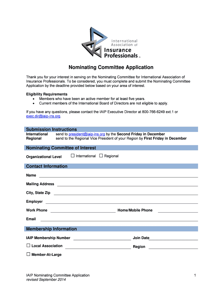 Get the free Nominating Co mmittee Application - internationalinsuranceprofessionals