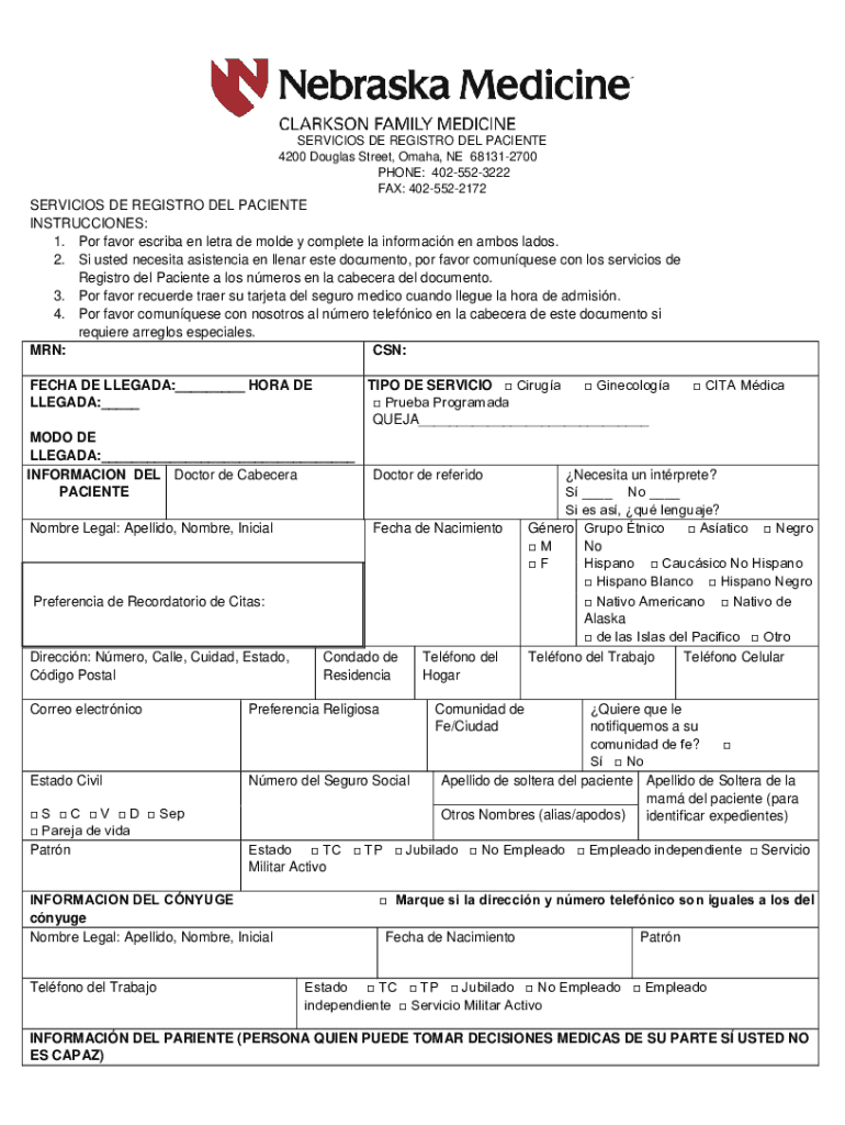SERVICES DE REGISTRY DEL PATIENTS 4200 Douglas Street, Omaha, NE 681312700 PHONE: 4025523222 FAX: 4025522172SERVICIOS DE REGISTRY DEL PATIENTS INSTRUCTIONS: 1. POR favor describe en Petra de mode