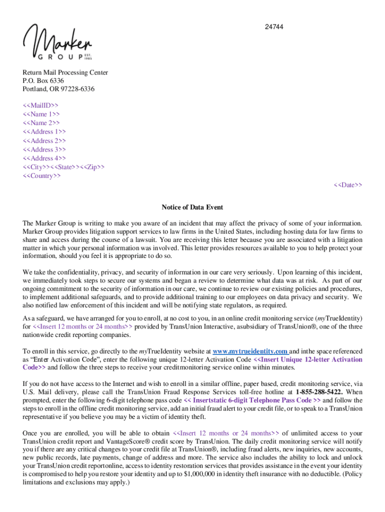 24744Return Mail Processing Center P.O. Box 6336 Portland, OR 972286336 Mailed Name 1 Name 2 Address 1 Address 2 Address 3 Address 4 CityStateZip Country Date Notice of Data Event The Marker Group