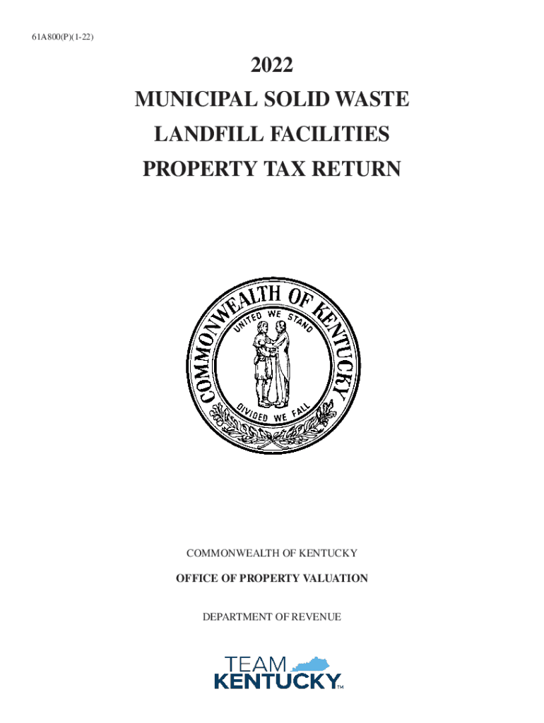 61A800×P)(122×2022 MUNICIPAL SOLID WASTE LANDFILL FACILITIES PROPERTY TAX RETURNCOMMONWEALTH OF KENTUCKYOFFICE OF PROPERTY VALUATION DEPARTMENT OF Revenuers may be obtained from: revenue.KY.taxpayer