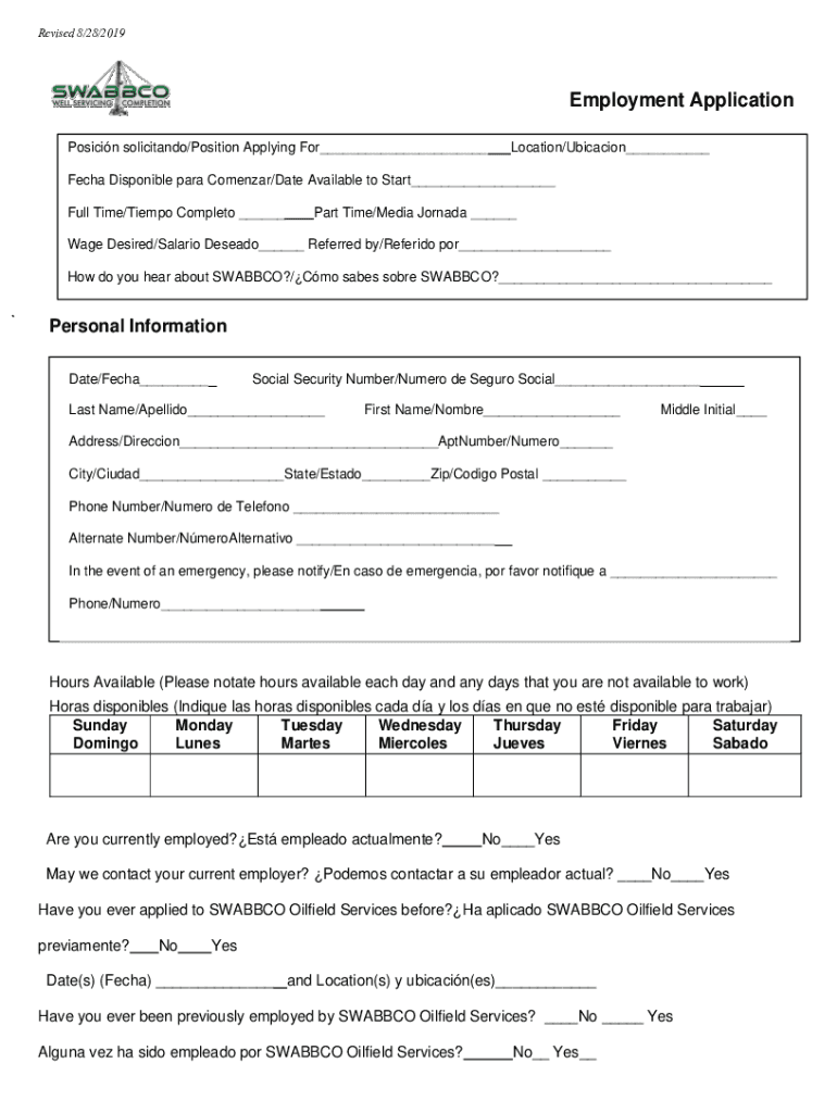 Revised 8×28/2019Employment Application Position solicited×Position Applying For___Location×Ubicacion___Tech Disposable para Calendar×Date Available to Start___ Full Time×Tempo Complete ___Part