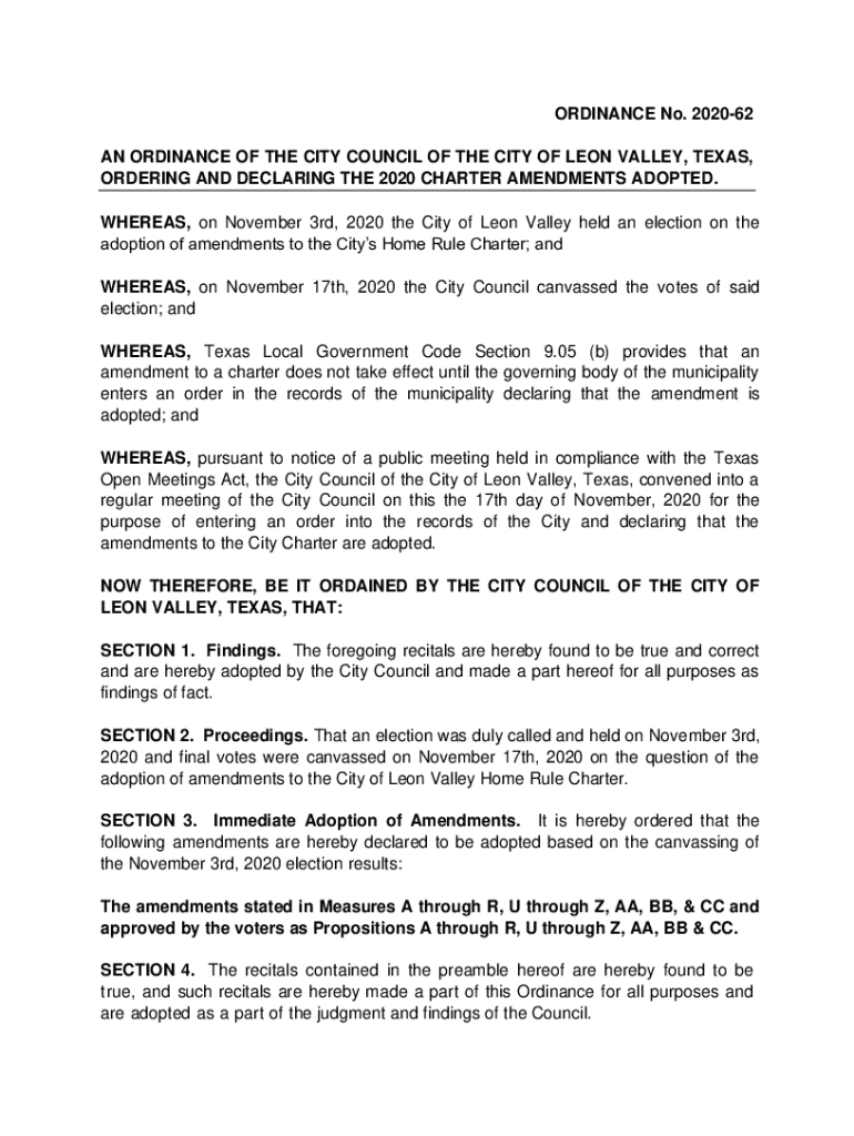 ORDINANCE No. 202062 AN ORDINANCE OF THE CITY COUNCIL OF THE CITY OF LEON VALLEY, TEXAS, ORDERING AND DECLARING THE 2020 CHARTER AMENDMENTS ADOPTED. WHEREAS, on November 3rd, 2020 the City of Leon