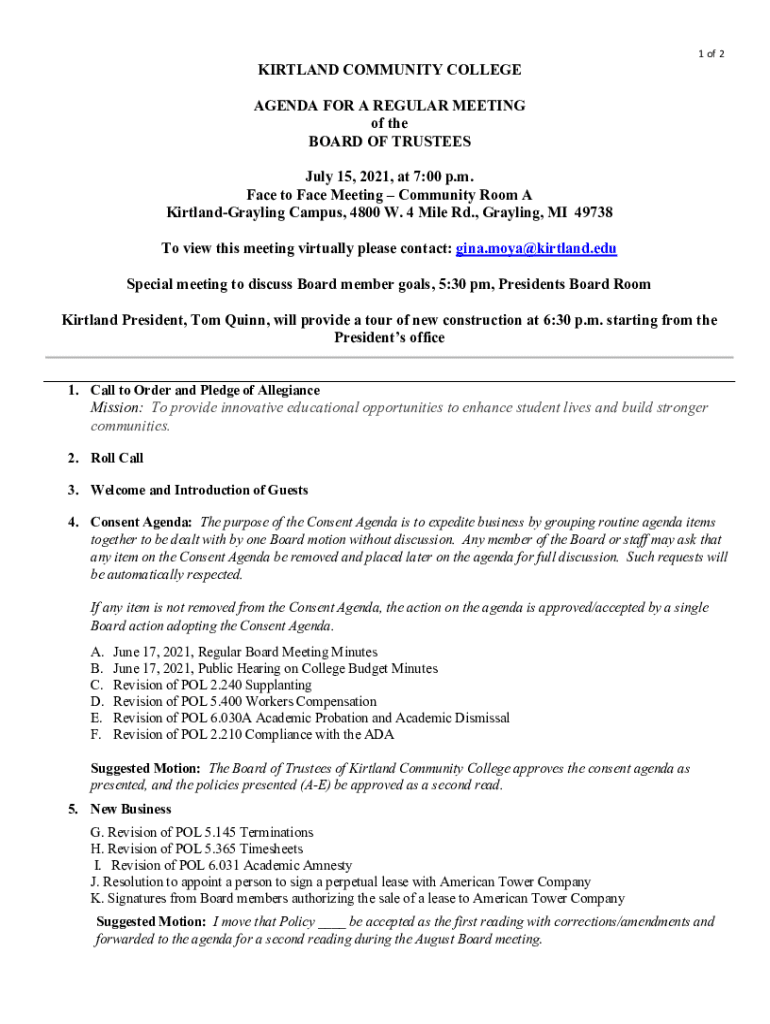 KIRTLAND COMMUNITY COLLEGE1 of 2AGENDA FOR A REGULAR MEETING of the BOARD OF TRUSTEES July 15, 2022, at 7:00 p.m. Face to Face Meeting Community Room A KirtlandGrayling Campus, 4800 W. 4 Mile Rd.,