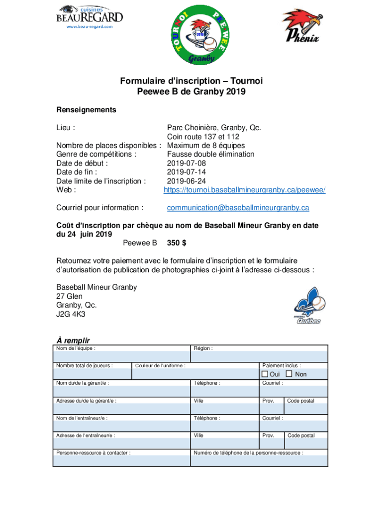 Formula ire inscription Tourney Peewee B de Granby 2019 Restatements Lieu :PARC Chinese, Granby, QC. Coin route 137 ET 112 Hombre DE places disposables : Maximum DE 8 quips Genre DE competitions :